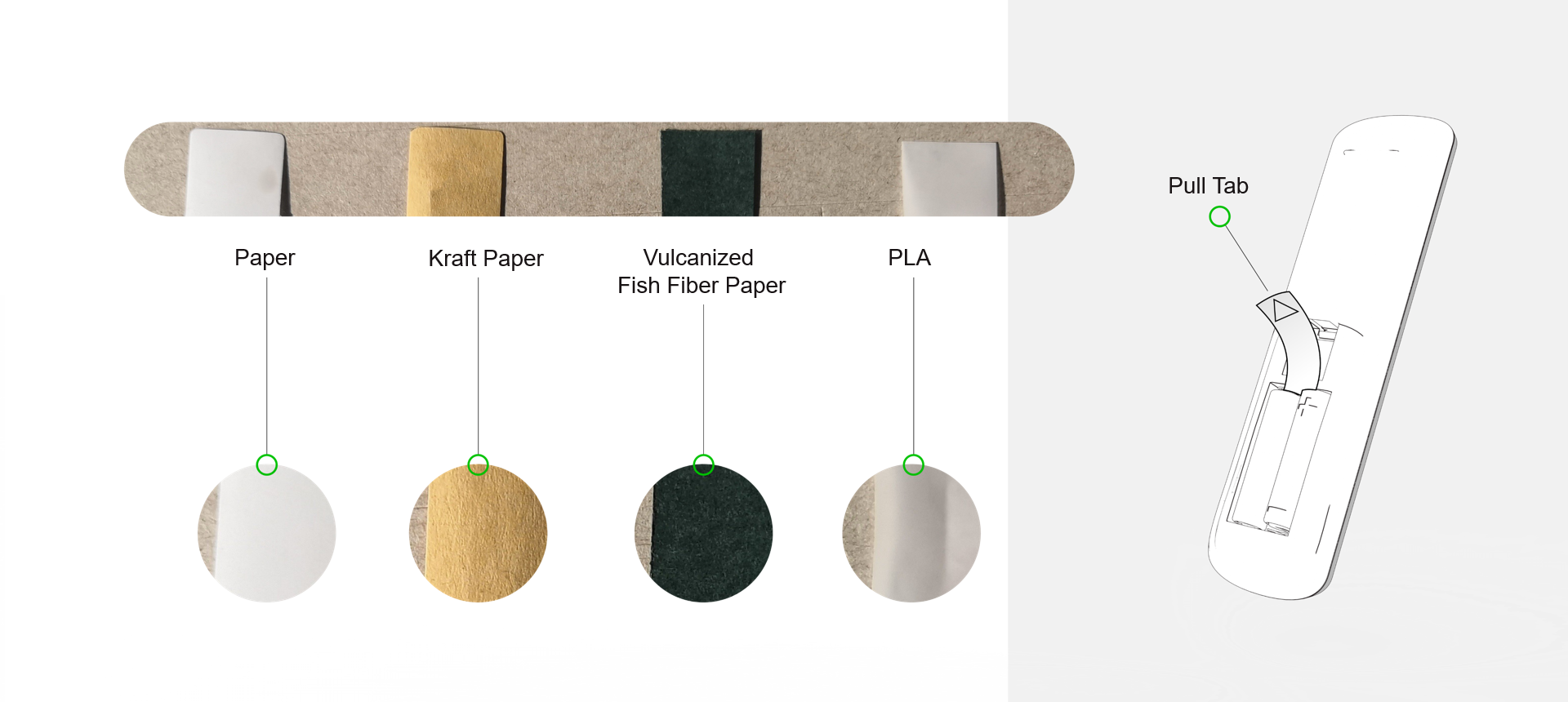 The alternative solution to a pull tab is to keep the batteries outside of the remote. Our SUP-free solution for this is a carton battery box  that can neatly hold two AAA batteries.